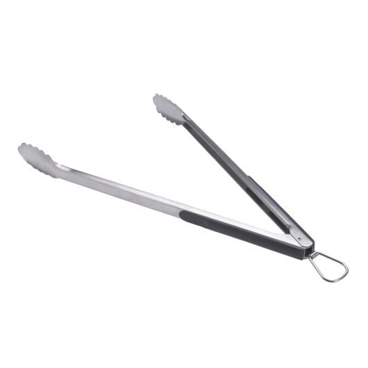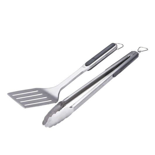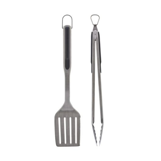 Set includes a 16" Grilling Turner with a wide head and beveled edge for sliding under foods and scraping off the grill. One side of Turner head is serrated for cutting meat. Also includes Tongs with angled, scalloped heads for lifting even heavy food to remove from the grill.