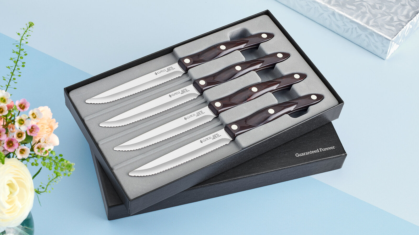 Impressive in size and heft and a substantial knife at mealtime. Effortlessly cut through the thickest steaks and other meats. Four of our big and bold Steak Knives in a gift box.
