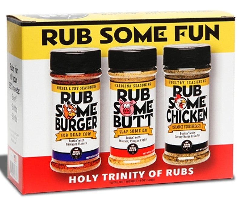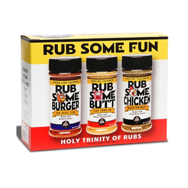 The holy trinity of rubs, featuring rubs for all your BBQ needs. This three pack box with rub some burger, rub some chicken and rub some butt is the perfect gift for any BBQ fan.