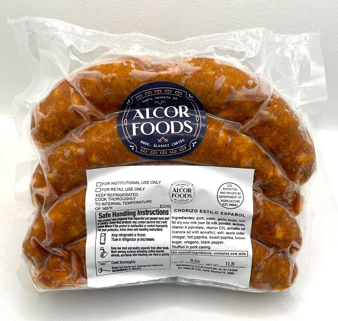 El Chorizo Espanol (Alcor Foods) es elaborado localmente en Puerto Rico. Su deliciosa textura y sabor lo hacen ideal para realizar tus recetas favoritas. Se define entre el balance de jugosidad, gusto y aroma.
