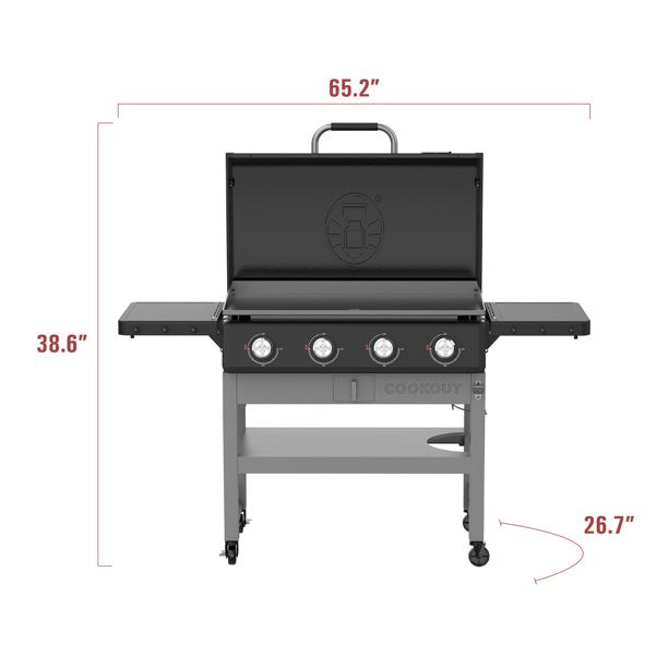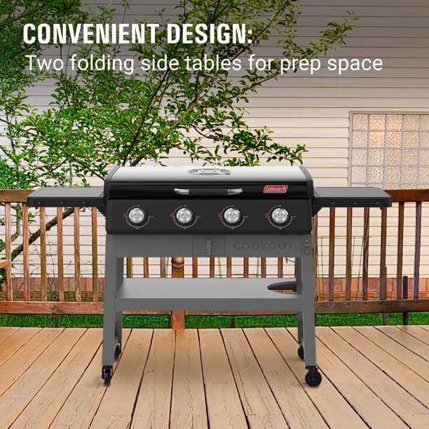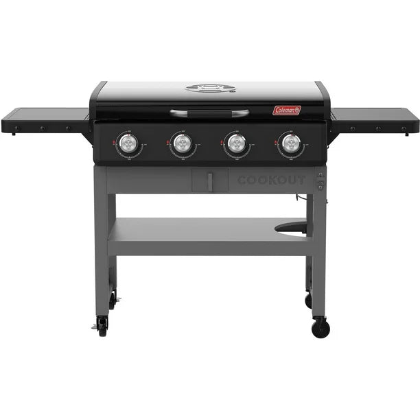 Outdoor cooking made easy. Cook anything, anytime, with the Coleman Cookout 4-Burner Griddle Station right in your own backyard. This versatile griddle grill offers the convenience of preparing a multi-course meal-breakfast, lunch and dinner-all at the same time, on 1-smooth, flat surface. This spacious griddle allows you to prepare more dishes than a traditional grill, like large batches of pancakes or bacon and eggs. Griddles also have a fantastic way of locking in those delicious flavors because the surface is flat and the juices can't escape or drip away into the coals. The Instastart push-button matchless lighting system makes ignition fast and easy. 4-independently controlled stainless steel U-shape burners deliver up to 60,000 BTUs of griddle power under 720 sq. in. of hot-rolled steel, fitting up to 36-burgers. The convenient cart has 4-caster wheels for easy placement, integrated tool hooks and a towel holder, plus 2-side shelves and a bottom shelf for holding ingredients. It's hard to beat the versatility of a griddle grill. Thinking beyond burgers and steaks, recipes like paninis, stir fry or Italian sausages with grilled peppers and onions can easily be added to your outdoor menu.