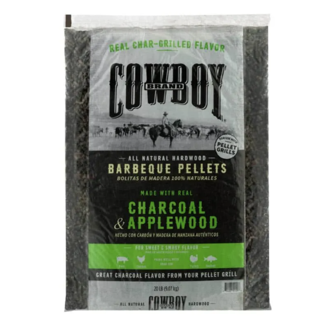 Cowboy® Charcoal & Apple Barbeque Pellets are made with real applewood and hardwood charcoal, with no additives. The addition of charcoal to the pellet adds an authentic char-grilled flavor to your foods. For a bold and hearty flavor, use charcoal & applewood barbeque pellets to cook pork, chicken, turkey and seafood.