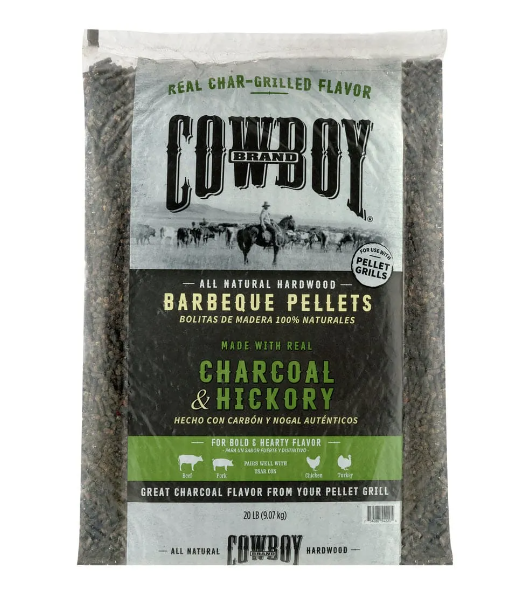 Cowboy® Charcoal & Hickory Barbeque Pellets are made with real hickory wood and hardwood charcoal, with no additives. The addition of charcoal to the pellet adds an authentic char-grilled flavor to your foods. For a bold and hearty flavor, use charcoal & hickory barbeque pellets to cook beef, pork, chicken and turkey.