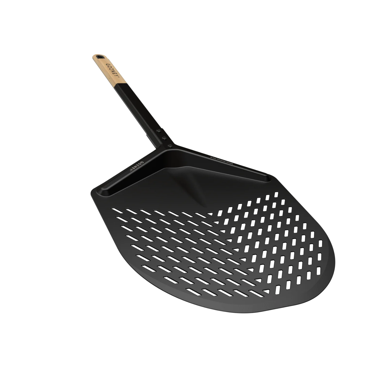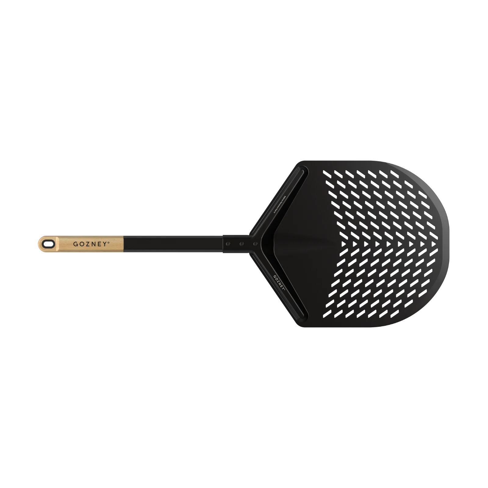 Next-level performance is effortless to handle with the Balance Placement Peel. Combining the lightweight aluminum blade with a comfortable Beech wood handle, this durable placement peel enables you to launch pizzas with greater ease and control. The blade is designed with a flat nose to increase stability and reduce rocking from side to side while sliding on or launching pizzas into the oven, so your pizza keeps its shape during transfer. The perforated metal lets excess flour fall through for delicious crust without the unwanted burnt taste. Designed to be ergonomic, the wood handle shifts the center of gravity closer to the hand for more control. The soft touch of the wooden handle is timeless and classic in its feel. Create pizza with confidence with the perfect balance of performance and ease.