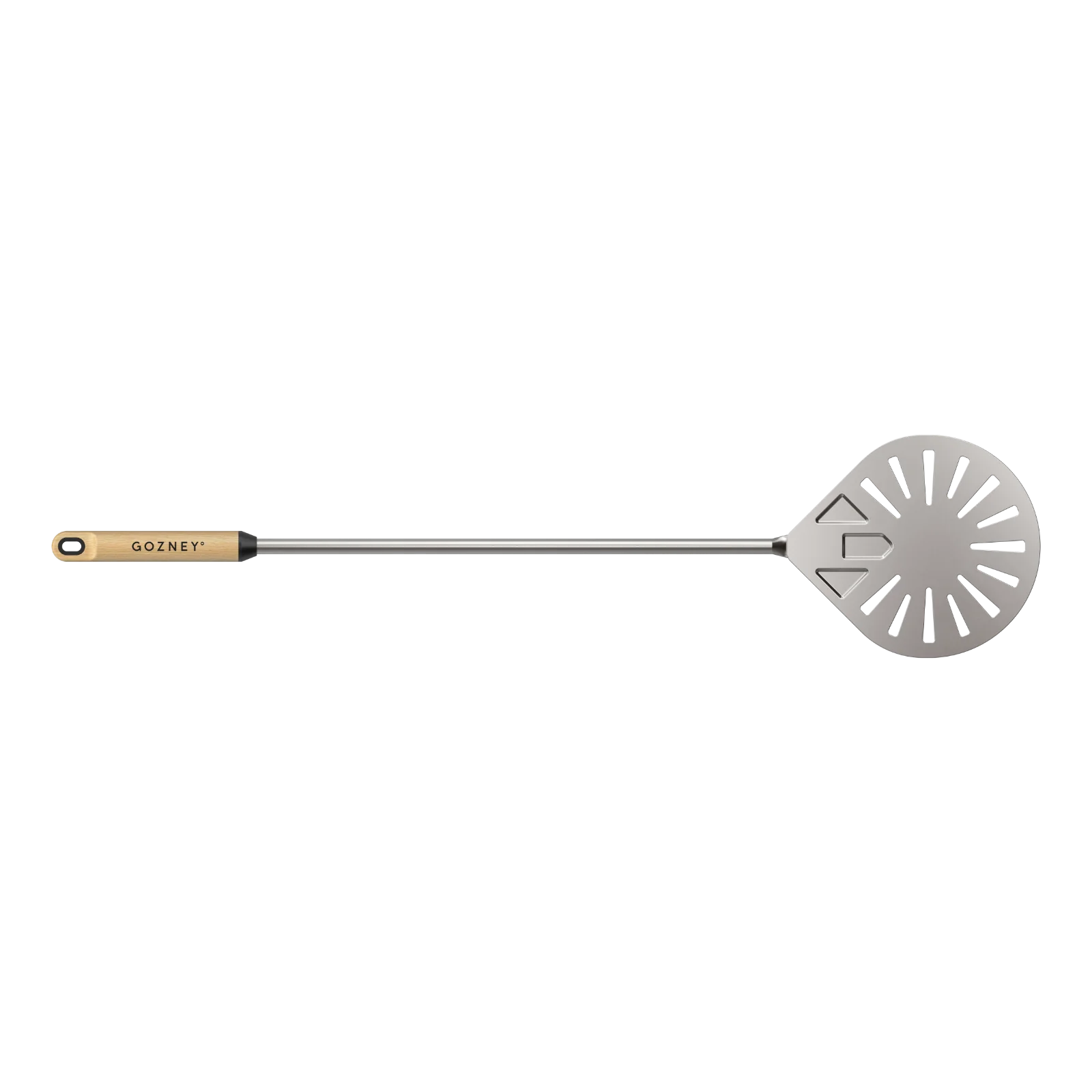 Next-level performance is effortless to handle with the Balance Turning Peel. Combining a larger aluminum blade with a comfortable Beech wood handle, this durable turning peel enables you to turn and move pizza with greater ease and control. The tear drop shape is designed to enhance the turning motion, with the entire blade being pressed and welded for a snag-free experience. The perforated metal lets excess flour fall through for delicious crust without the unwanted burnt taste. Designed to be ergonomic, the wood handle shifts the center of gravity closer to the hand for more control when moving pizza. The soft touch of the wooden handle is timeless and classic in its feel. Create pizza with confidence with the perfect balance of performance and ease.