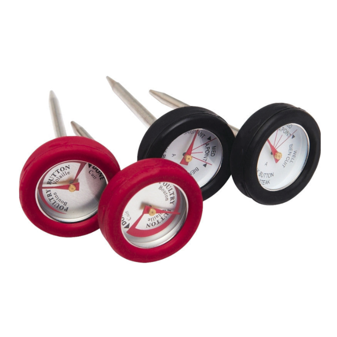 4 pack of mini meat thermometers with silicone bezels for easy removal from cooked foods and individual cuts of meat. 2 pieces calibrated for steak in black and 2 calibrated for chicken in red.