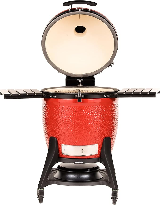 - Premium 24″ ceramic grill with heavy-duty galvanized steel rolling cart with locking wheels.