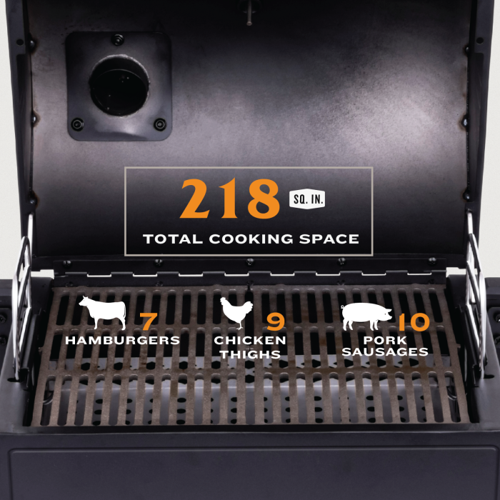 • SIZE: 218 sq. in of cooking space to cook up to 6 burgers, 6 steaks or 12 bratwurst