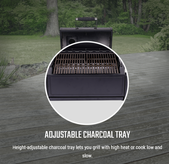 • FUEL: Height-adjustable charcoal tray lets you grill with high heat or cook low and slow