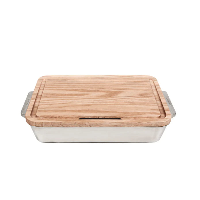 It includes a premium white oak cutting board with an innovative tilted design and grooves to collect all the delicious roasting juices for savory sauces and gravies.