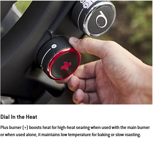 Plus burner (+) boosts heat for high-heat searing when used with the main burner or when used alone, it maintains low temperature for baking or slow roasting.