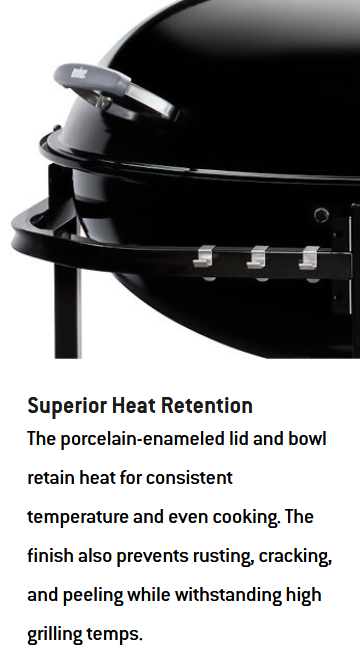 Superior Heat Retention. The porcelain-enameled lid and bowl retain heat for consistent temperature and even cooking. The finish also prevents rusting, cracking, and peeling while withstanding high grilling temps.