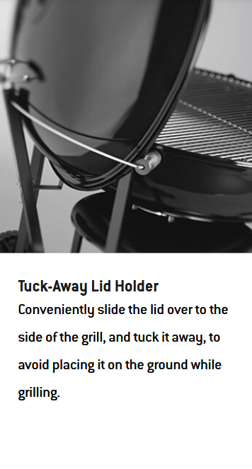 Tuck-Away Lid Holder. Conveniently slide the lid over to the side of the grill, and tuck it away, to avoid placing it on the ground while grilling.
