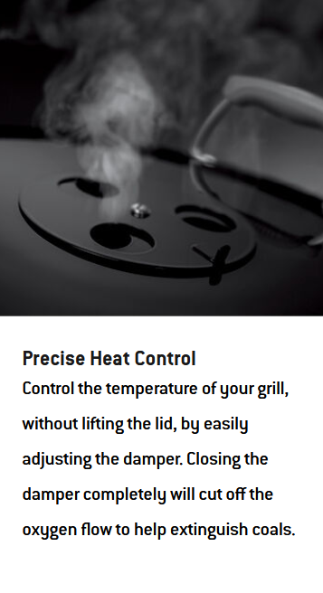 Precise Heat Control. Control the temperature of your grill, without lifting the lid, by easily adjusting the damper. Closing the damper completely will cut off the oxygen flow to help extinguish coals.