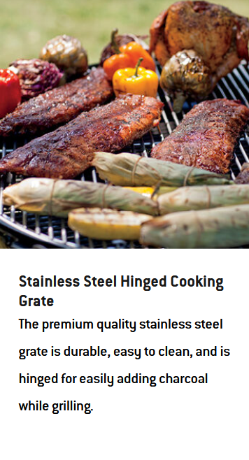 • Premium-quality stainless steel grate is hinged for easily adding charcoal while grilling