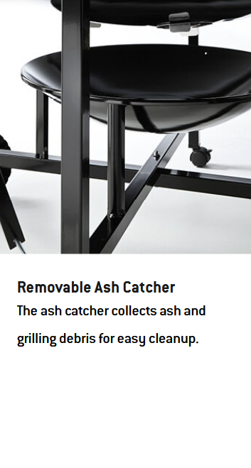 Removable Ash Catcher. The ash catcher collects ash and grilling debris for easy cleanup.