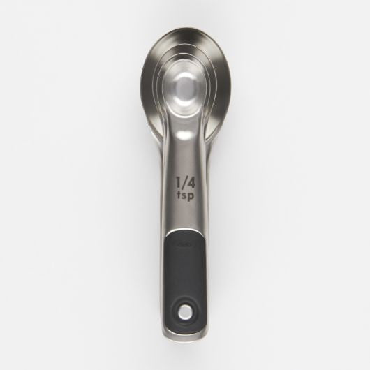 The Stainless Steel Measuring Spoons' unique magnetic feature keeps the spoons neatly stacked together and allows you to easily remove one at a time. The soft, comfortable, non-slip handles feature permanent, etched measurement markings. Set includes 1/4 tsp, 1/2 tsp, 1 tsp and 1 T Spoons.