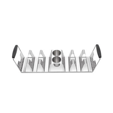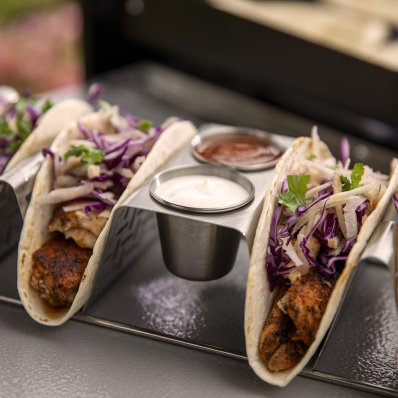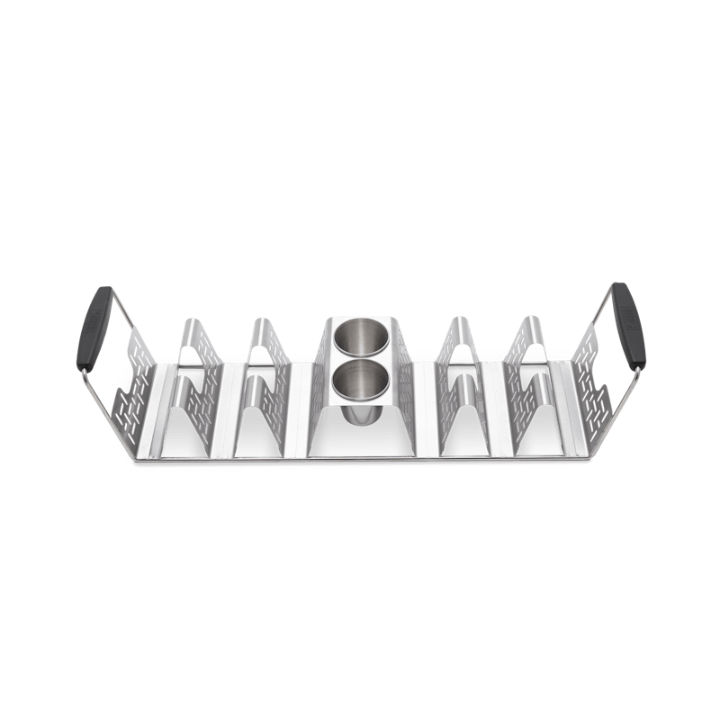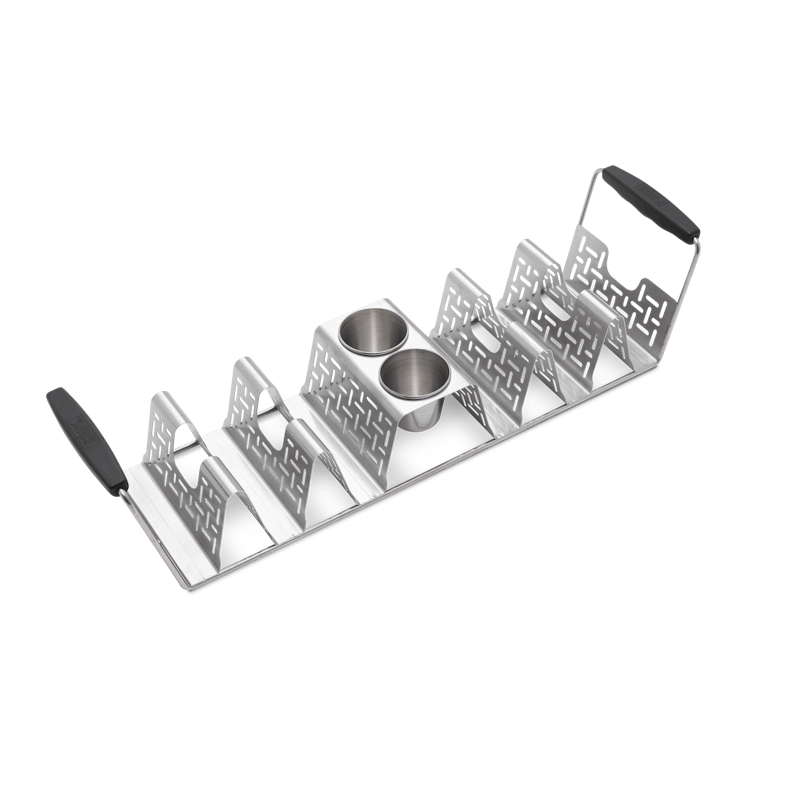 Make everyday taco day. Hold up to six tacos in this premium stainless steel taco rack. Designed with silicone handles to easily transport from grill to table. When everyone’s ready to dig in, two built-in sauce cups keep guac and salsa nearby.