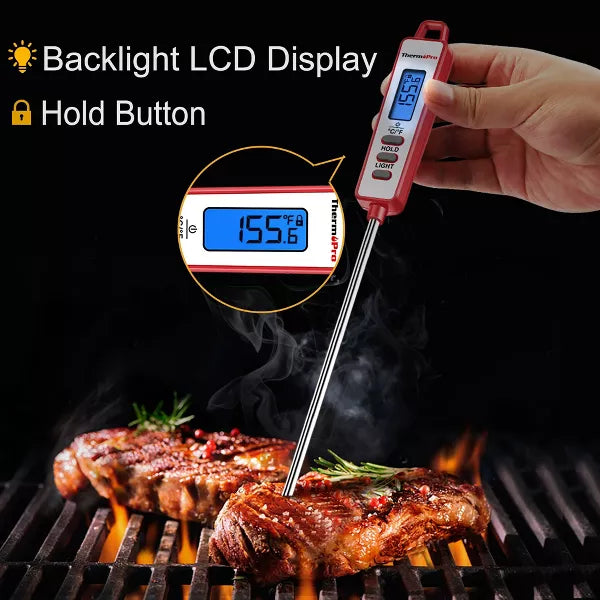 ThermoPro digital meat thermometer is an easy and effective cooking tool to get the most accurate temperature in a matter of seconds. 5.35″ super long food grade stainless steel probe with Step-down Tip to ensure an ultra-fast 4-7 seconds response time and accurate reading (±0.9°F), while also keeping your hands away from the heat when cooking at the grill or in the oven. It’s the best way to know whether the grilled food is cooked to a safe internal temperature, as well as to your preferred doneness. By using the food thermometer, you can ensure the perfect temp every time you’re grilling or cooking and make your meal taste like it was prepared by a professional!