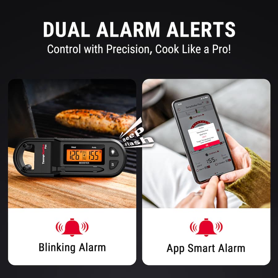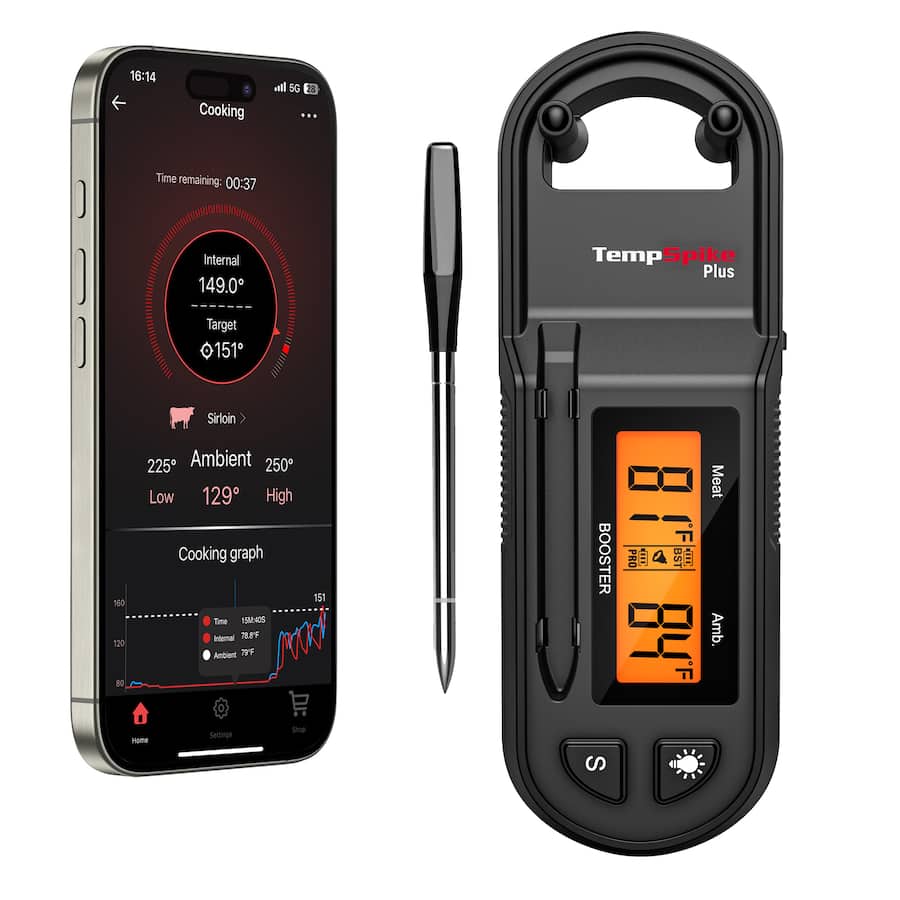 ThermoPro TempSpike Plus Meat Thermometer features a sleek, thin probe designed for precise readings without damaging your meat completely wire-free. Built with IP67 waterproofing and a zirconia ceramic head, it withstands temperatures up to 1050°F for exceptional durability. Powered by Bluetooth 5.2, it offers an impressive 600 ft range, letting you monitor cooking from anywhere. The Booster’s real-time display eliminates the need to constantly check your phone, making multitasking a breeze. With hassle-free setup—no accounts or WiFi needed—and an app offering USDA temperature guides and alerts, this thermometer ensures perfect results every time. A must-have gift for BBQ lovers and grill masters!