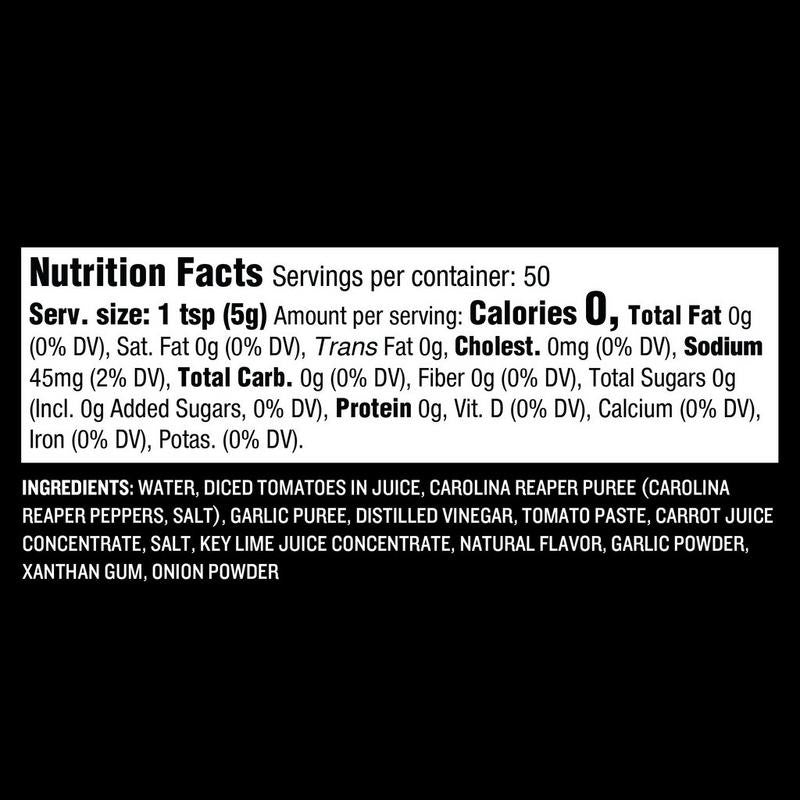 Splash this tongue-scorching sauce on your food to take your tastebuds on a fiery ride—if you dare. It features devilishly hot Carolina Reaper peppers blended with garlic for bold, super-spicy flavor that could wake the dead.